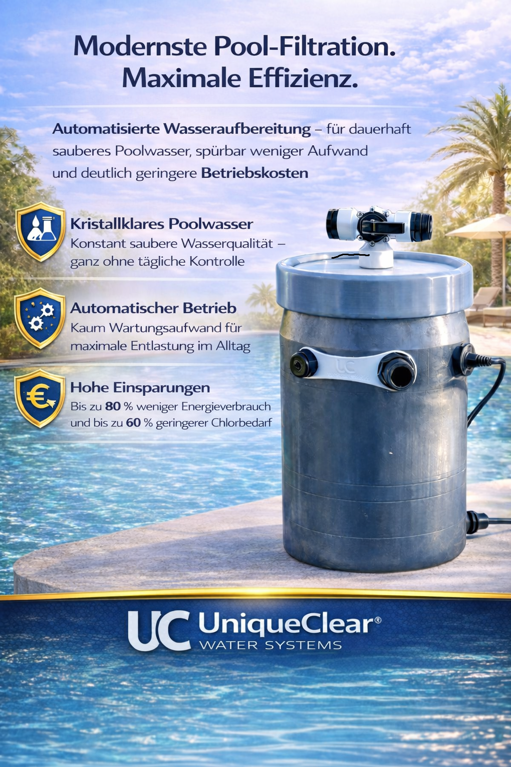 Mit dem Unique Clear Filtersystem verbessern Sie die Wasserqualität Ihres Pools effizient, nachhaltig und zuverlässig.